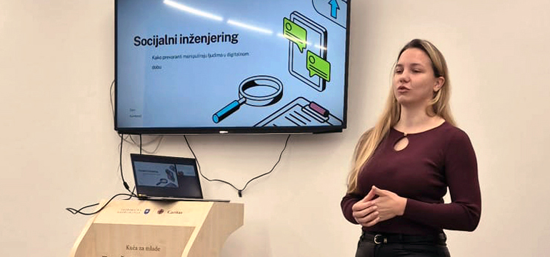 Korisnici zagrebačkog Caritasa na smještaju u njegovoj kući u Selskoj cesti na Trešnjevci slušali su 20. travnja predavanje o socijalnom inženjeringu, kojim započinje 98% svih kibernetičkih napada, što znači da je najslabija karika u digitalnoj sigurnosti čovjek - ističe stručnjakinja Dani Karabatić.
